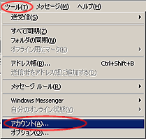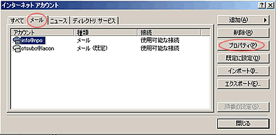 | 1、 | メニューバーの【ツール】→【アカウント】→【メール】→【プロパティ】とクリックしていきます。 | |||