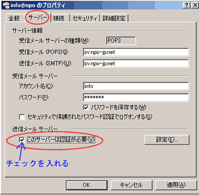 【サーバー】タブをクリックしていき、 送信メールサーバ内の【このメールサーバーは認証が必要】にチェックを入れます。 |